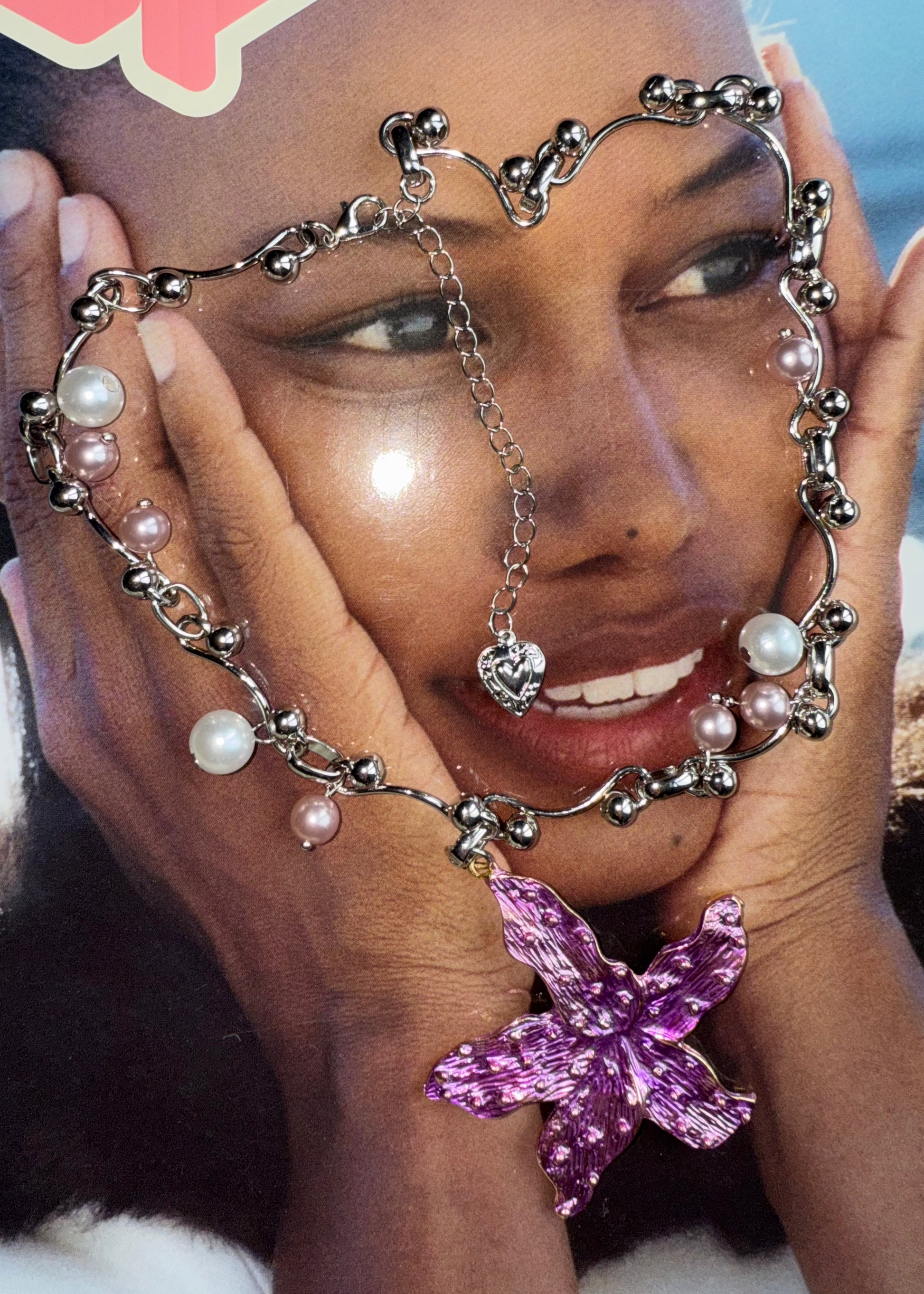 Beatrice By The Sea Halskette mit rosa Perlen und Seesternen im Grunge-Stil, Silber