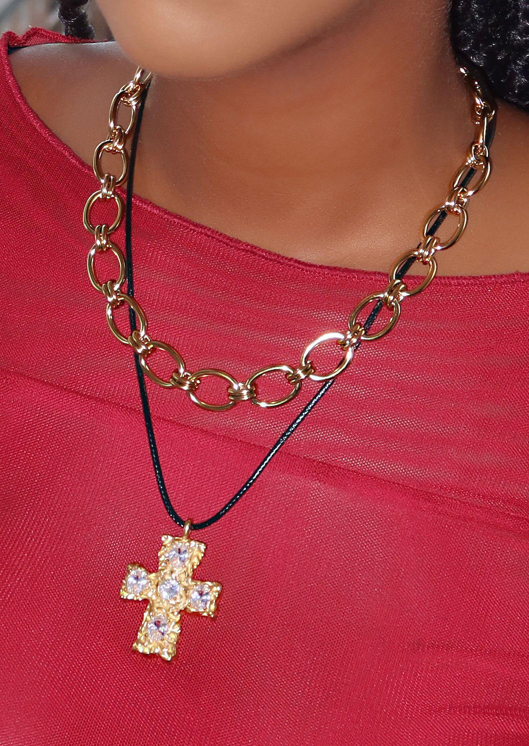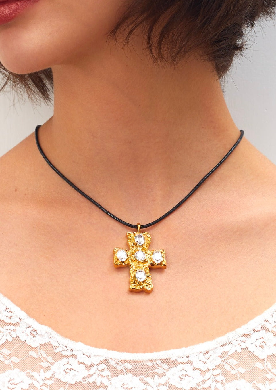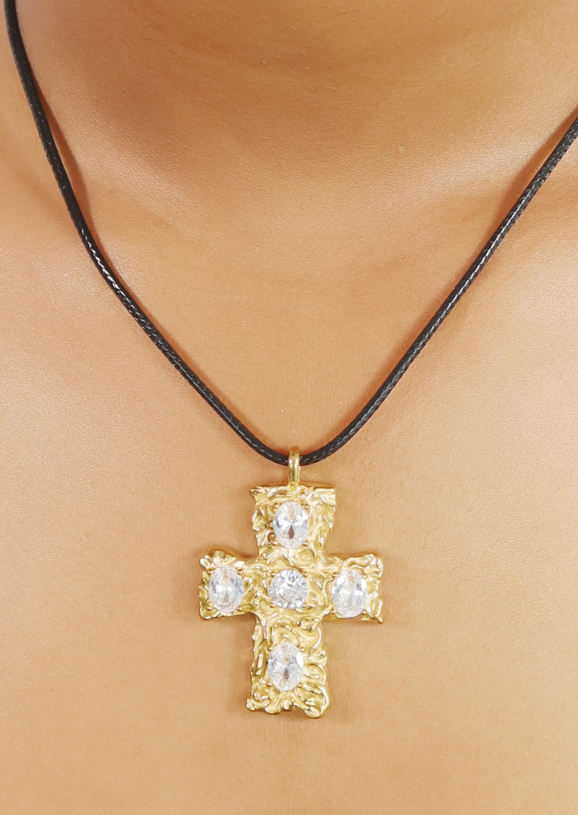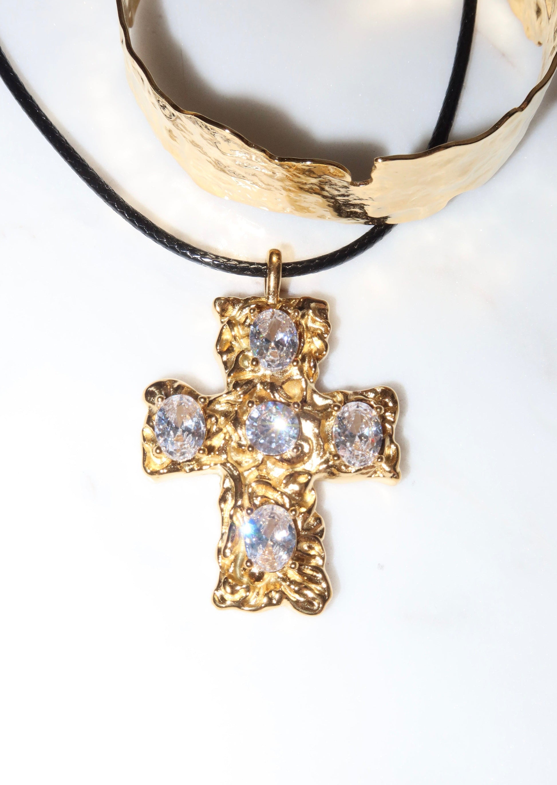 Mit einem goldenen Kreuz im Vintage-Stil, das mit funkelnden Zirkonia-Steinen verziert ist, ist es die perfekte Mischung aus klassischer und zeitgenössischer Eleganz.